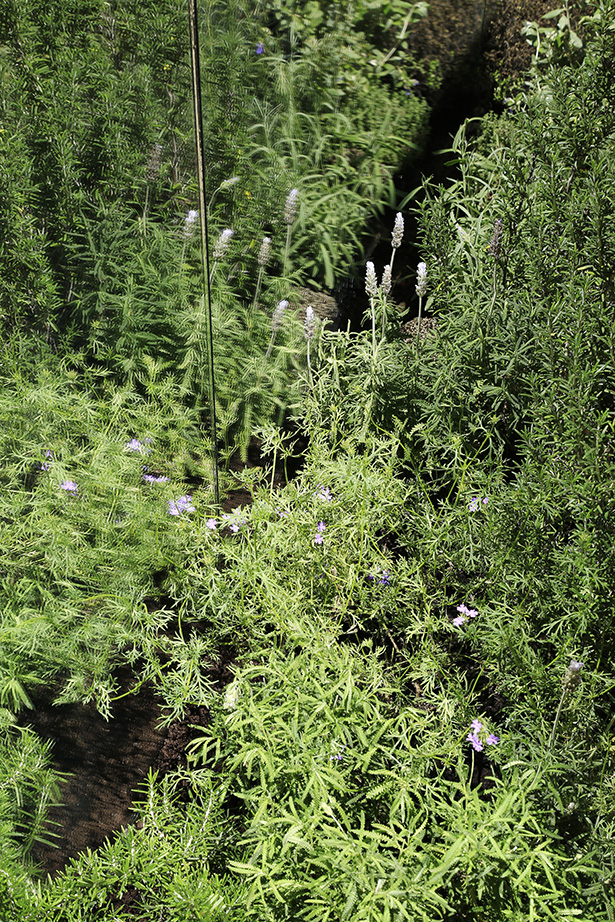 L’installation suggère au visiteur l’expérience d’un scénario futur. Le dispositif est simple : un miroir sans tain face à un miroir simple. Le visiteur, placé derrière le premier, s’y contemple. Mais en avançant, ce n’est plus son image qu’il voit : c’est celle de l’autre miroir et de la masse végétale qui se situe dans l’interstice entre les deux miroirs, qui se reflète à l’infini – une vision possible de l’espace submergé par la nature qui absorbe toutes les traces laissées par l’Homme sur l’écosystème, dans 2000 ans.