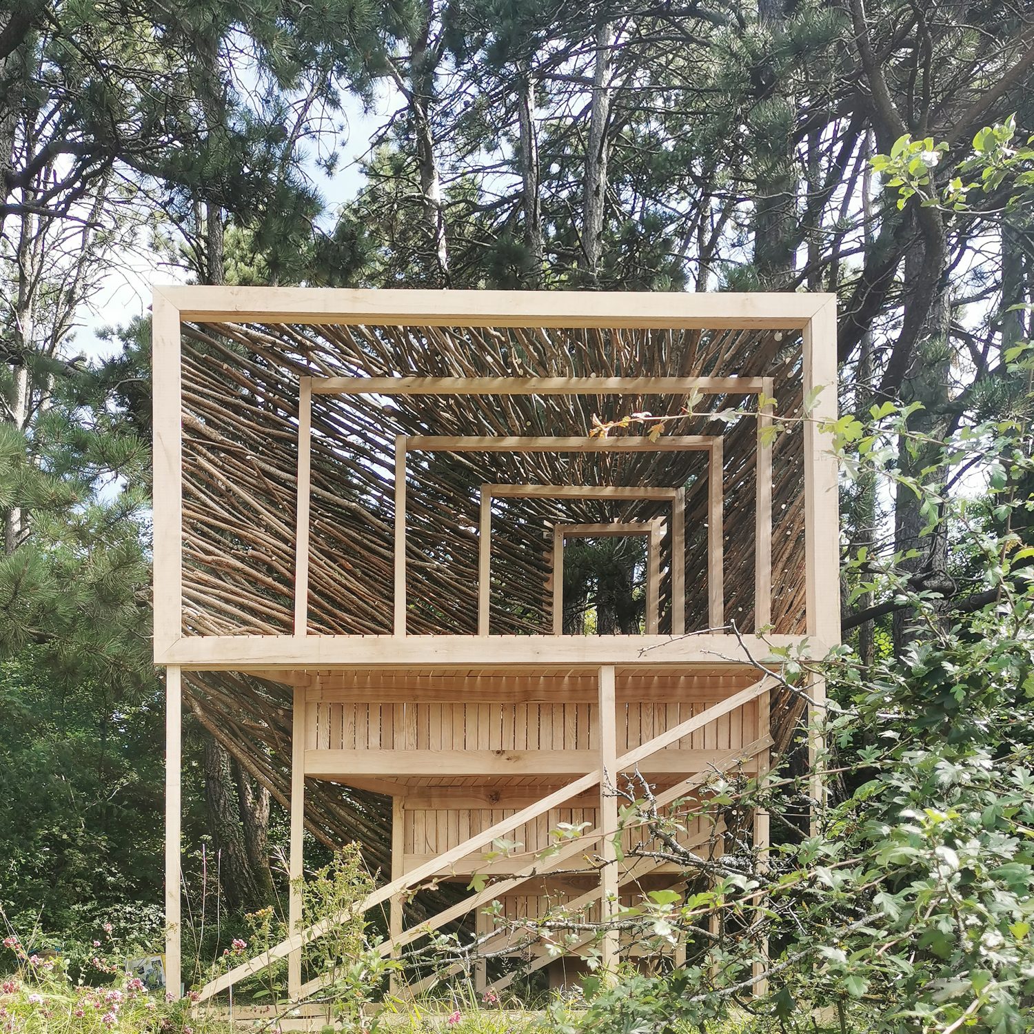 Sa forme est le produit de sa fonction : une faille dirigée vers les arbres et un panorama horizontal sur le vallon se connectent, donnant forme à un volume énigmatique. La verticalité de l’entrée qui fait écho à celle des troncs est une promesse pour le curieux. Elle appelle le corps à passer et à gravir les gradins qui mènent à son sommet.