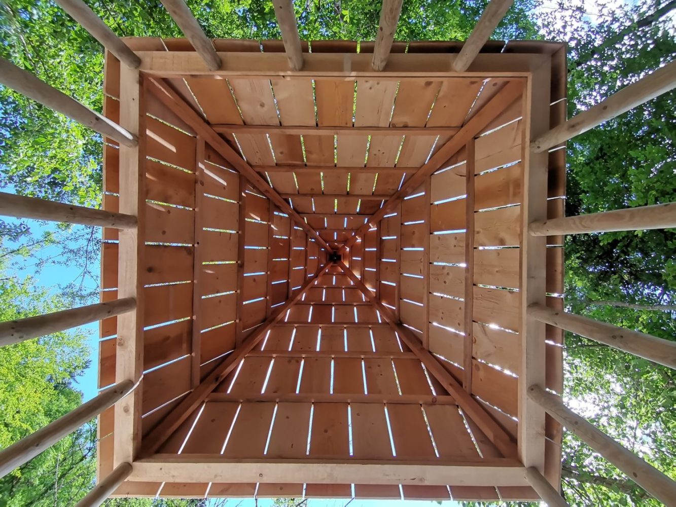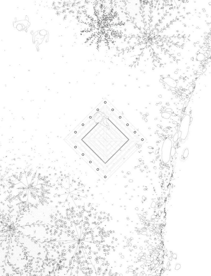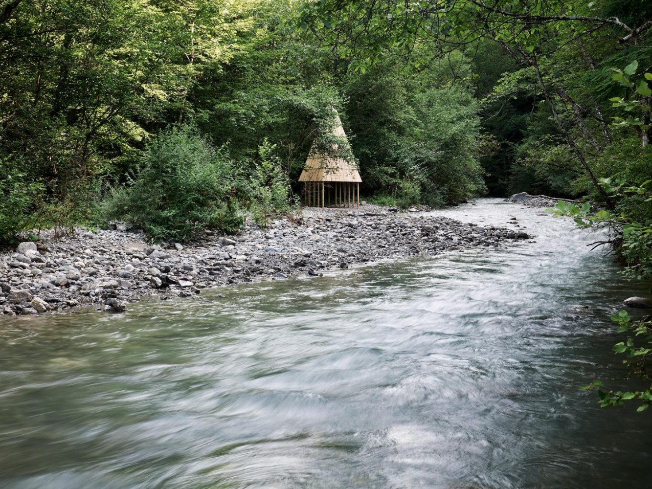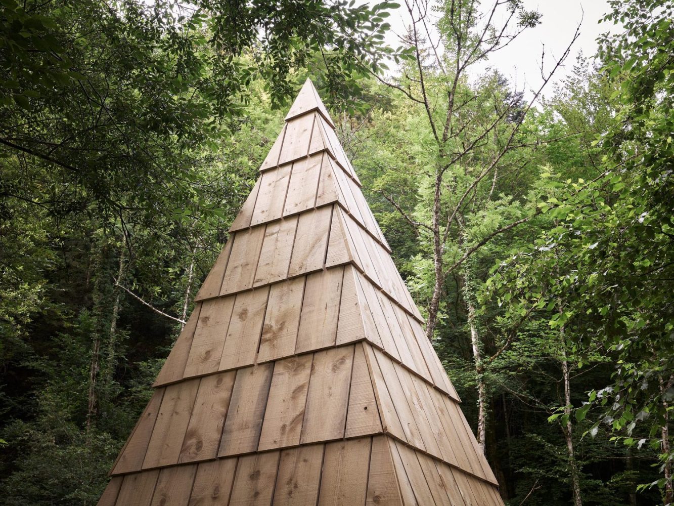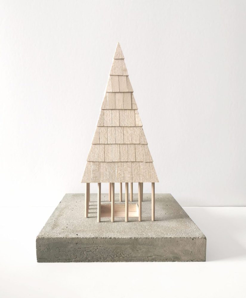 L’Oratoire de la Chaise est un espace intermédiaire, entre le dedans et le dehors, dans lequel on vient se glisser pour observer et échanger avec la nature qui l’étreint. La mise en œuvre de sa grande toiture pyramidale qui nous happe vers le haut souligne une technique ancrée dans l’histoire de l’architecture de Haute Savoie : le tavaillon. Ces planchettes de bois donnent une nouvelle dimension à ce toit protecteur, qui vibre selon la lumière et le point de vue.